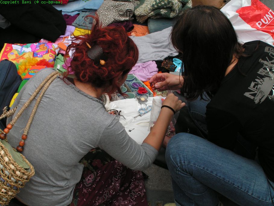 Mercat d'Intercanvi a la Plaça del Diamant. Dinar Olla Mòbil amb coses aportades per tothom. Festa 6 anys Ateneu Rosa de Foc