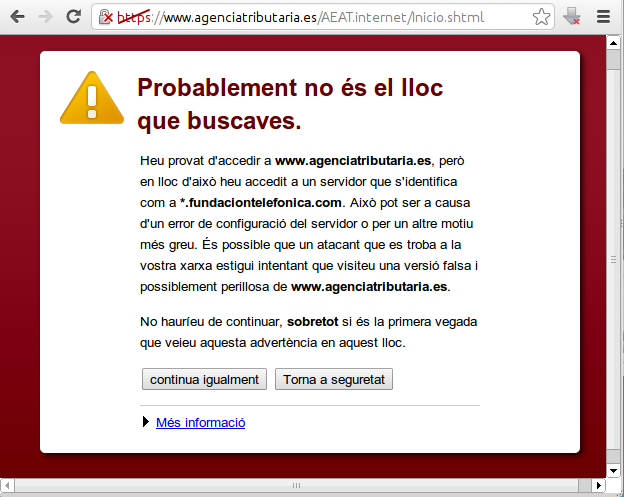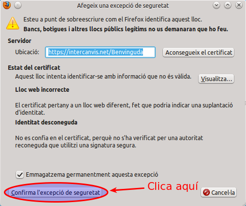 I després, a la següent pantalla, cal clicar a "Confima l'excepció de seguretat":
